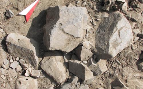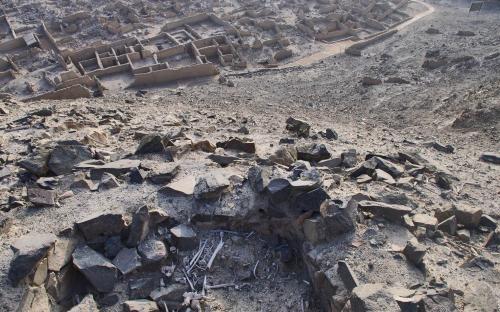 Uno de los espacios intervenidos mediante el descombrado fue la Calle 1, en la que se ubicó un grupo de huesos humanos, correspondientes a individuos incompletos con evidencias de haber estado expuestos a la intemperie. Entre estos huesos se recuperaron un grupo de cráneos humanos. El análisis realizado por la bioarqueóloga Elsa Tomasto, determinó que correspondían a cinco adultos y un adolescente; de los cuales dos cráneos adultos presentaban evidencias de fractura del tipo compresiva (ante mortem), pero también existían fracturas como posible causa de muerte (peri mortem).