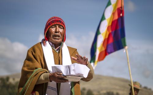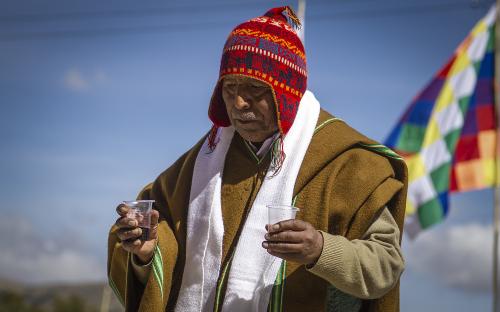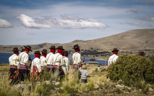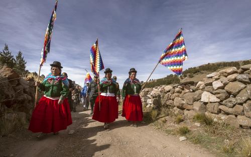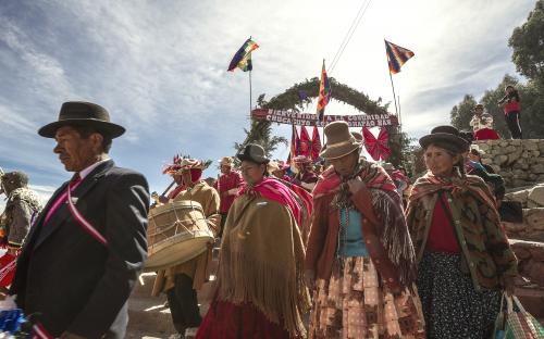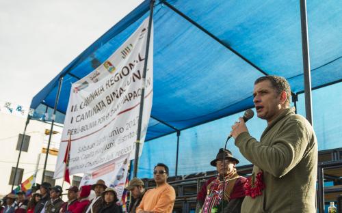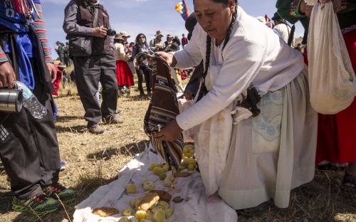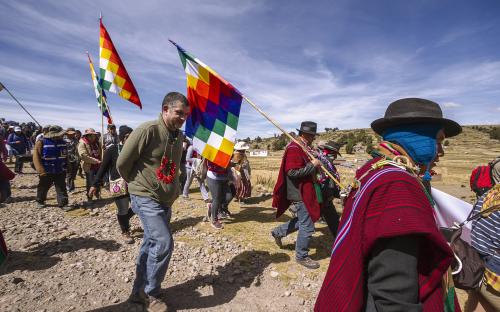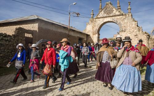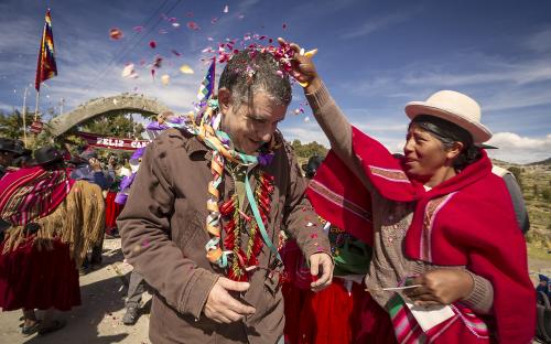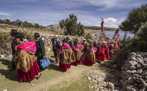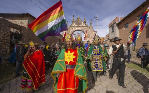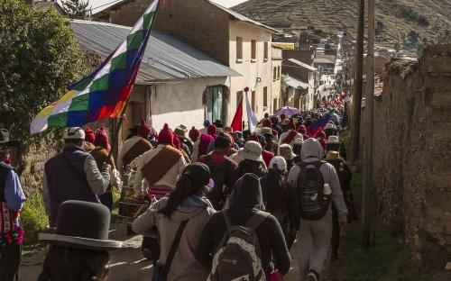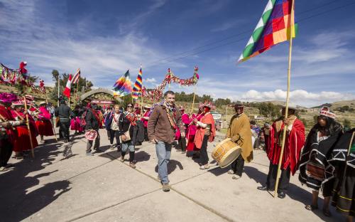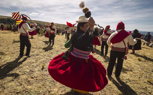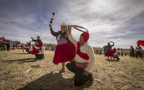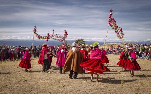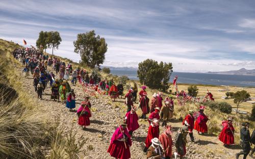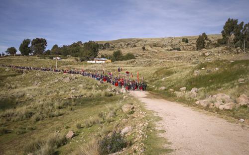 El recorrido continúo hasta la zona de Siwiqa Jawira-Arcopata, donde hubo una gran recepción con músicos y coreografías que representaron el ritual del encuentro entre incas y lipacas, y la danza de los Carapulis. Con ellos se retomó el trayecto con rumbo a la Plaza de Armas Ludovico Bertonio de la ciudad de Juli, denominada la Roma Aimara de América.