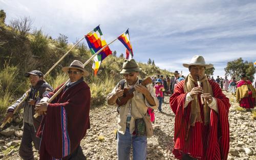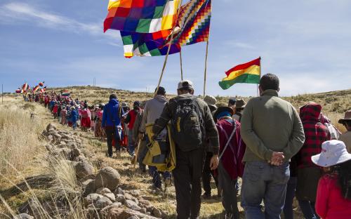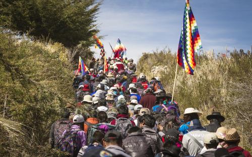 Culminada esta ceremonia, los caminantes enrumbaron acompañados de banderas bolivianas, peruanas, wiphalas y cánticos a viva voz por el Qhapaq Ñan o Jach’a Thaki, en lengua originaria. Asimismo, músicos y danzantes, acompañaron a los participantes durante todo el recorrido.