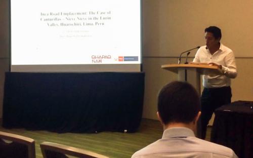 Los arqueólogos Edines Pebe y Bryan Nuñez expusieron sobre los datos obtenidos tras las acciones realizadas en el proyecto de conservación de sección de camino prehispánico Canturillas – Nieve Nieve en la temporada 2016 en la ponencia “Inca Road Emplacement: The Case of Canturillas–Nieve-Nieve in the Lurin Valley, Huarochirí, Lima, Peru”