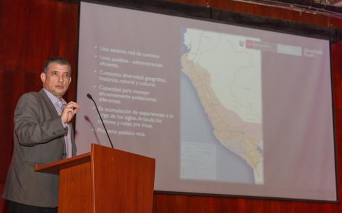 El simposio "Arqueología de las instituciones antiguas en los Andes: Tawantinsuyo 2016" que tuvo lugar en el Auditorio Los Incas, tuvo como expositores a los arqueólogos Sergio Barraza, quien trató el tema del sistema de chasquis incaico, el Dr. Giancarlo Marcone, con un enfoque sobre el Qhapaq Ñan como una institución social, y Camila Capriata que abordó el tema de las instituciones incas y su implicancia en la transformación administrativa del valle de Lurín.