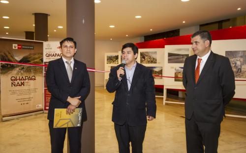Esta actividad se dio inicio con la inauguración de la exposición fotográfica “Qhapaq Ñan, el camino de la diversidad” a cargo del Coordinador del Qhapaq Ñan - Sede Nacional, Dr. Giancarlo Marcone Flores y el Decano Regional del Colegio de Arquitectos del Perú, Arq. José Antonio Vargas Vía. Esta muestra fotográfica, que continuará abierta al público visitante hasta el viernes 23 de octubre de 9:00 a 17:00 horas, registra en imágenes el trabajo de investigación, conservación y puesta en valor de los caminos incaicos en el país.