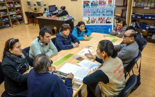 Este trabajo consistió en realizar las transcripciones en base a papeles impresos en tinta para los usuarios de la sala que presentan baja visión y sobre estos se transcribió en braille para los usuarios invidentes. En las transcripciones participaron especialistas de la sala de invidentes y del Qhapaq Ñan-Sede Nacional, cuatro usuarios y tres voluntarias, mientras uno dictaba la información de manera oral, el resto transcribía.