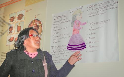 La ejecución del taller estuvo a cargo de la Magister Maritza Tovar Prado, de IP PERÚ, profesional entusiasta en la labor social para fomentar la participación de la población en la gestión de su patrimonio cultural.