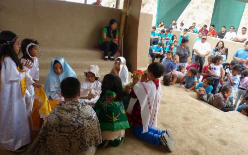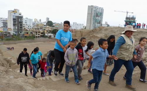 El programa se inició con la bendición del párroco Lenin Vásquez y fue seguida por la bienvenida que el equipo del proyecto integral dio a las más de 110 personas participantes, entre niños y madres vecinas de la Urb. Mateo Salado del Cercado de Lima y la Urb. Nueva Azcona de Breña. Luego se realizó un recorrido guiado por la Pirámide “A”, a cargo de miembros del proyecto integral y contó con el apoyo de los jóvenes voluntarios del Programa “Soy Cultura” del Ministerio de Cultura.